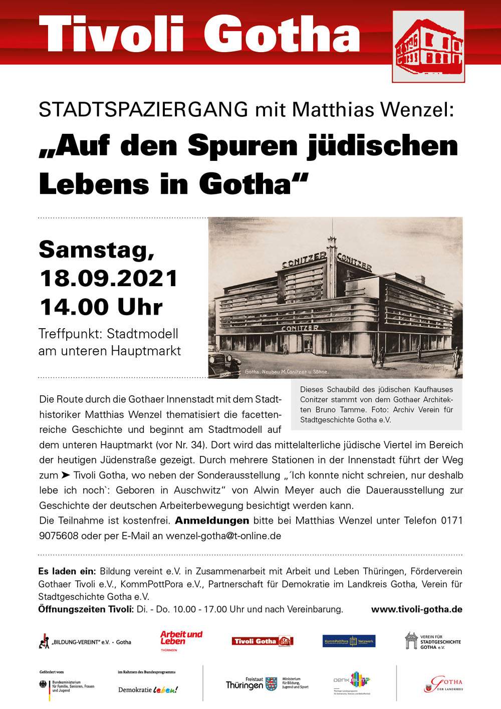 Samstag, 18.09.2021 14.00 Uhr Treffpunkt: Stadtmodell am unteren Hauptmarkt Die Route durch die Gothaer Innenstadt mit dem Stadthistoriker Matthias Wenzel thematisiert die facettenreiche Geschichte und beginnt am Stadtmodell auf dem unteren Hauptmarkt (vor Nr. 34). Dort wird das mittelalterliche jüdische Viertel im Bereich der heutigen Jüdenstraße gezeigt. Durch mehrere Stationen in [...]